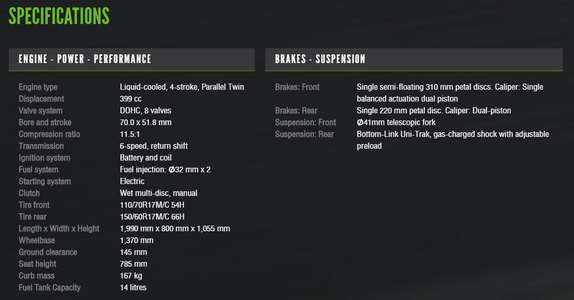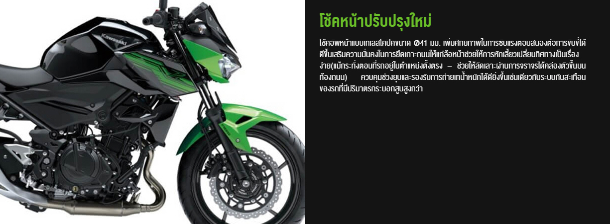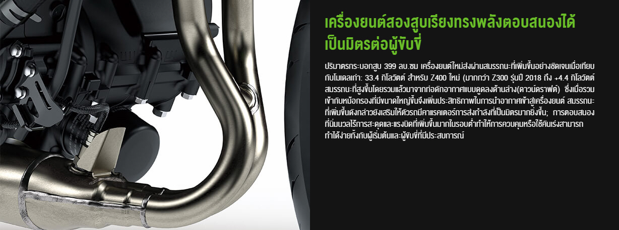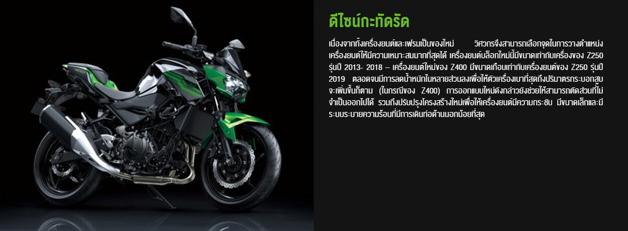 เพื่อให้เข้ากับสมรรถนะที่เร้าใจ ตื่นเต้นมากยิ่งขึ้น Z400 จึงมาพร้อมรูปลักษณ์ใหม่แบบเฉียบคม ดุดัน ซึ่งได้รับแรงบันดาลใจมาจากสไตล์ Sugomi ของรถรุ่นเรือธงในตระกูล Z จึงออกมาเป็นดีไซน์ใหม่ทั้งคันแบบ All-new ที่ผสมผสานไว้ด้วยกลิ่นอายของ Z650 และ Z300/250 สื่อให้เห็นถึงความคล่องแคล่ว ดุดันและแข็งแรงทรงพลัง